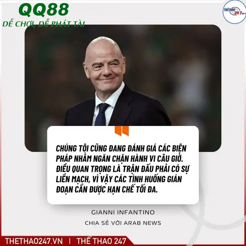 Bên cạnh đó, Infantino cũng nhấn mạnh một vấn đề đang nhận được nhiều sự quan tâm: “Chúng tôi cũng đang đánh giá các biện pháp nhằm ngăn chặn hành vi câu giờ. Điều quan trọng là trận đấu phải có sự liền mạch, vì vậy các tình huống gián đoạn cần được hạn chế tối đa,” Chủ tịch FIFA cho biết.